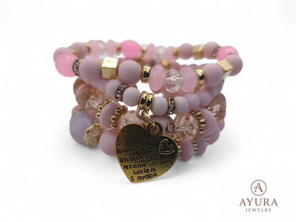 Set van 4 dames armbanden – Roze & goudkleurig met kralen & RVS bedels