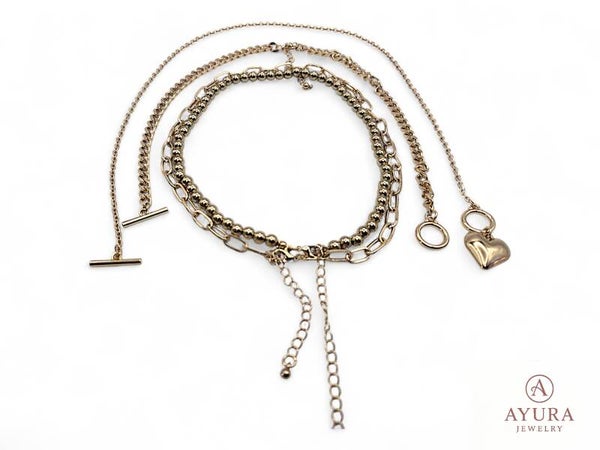 De set bestaat uit 4 kettingen met lengtes van 2x 35 cm, 1x 40 cm en 1x 45 cm, waardoor ze prachtig gelaagd gedragen kunnen worden. De schakels variëren in breedte van 2 mm tot 6 mm, wat zorgt voor een speels en elegant effect. Als finishing touch is de langste ketting voorzien van een hartvormige bedel, symbool van liefde en stijl.