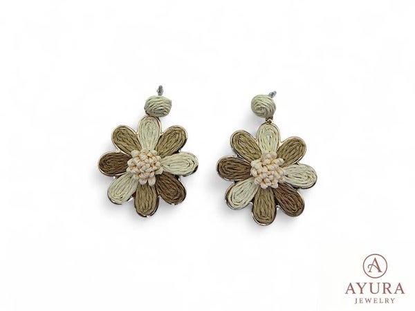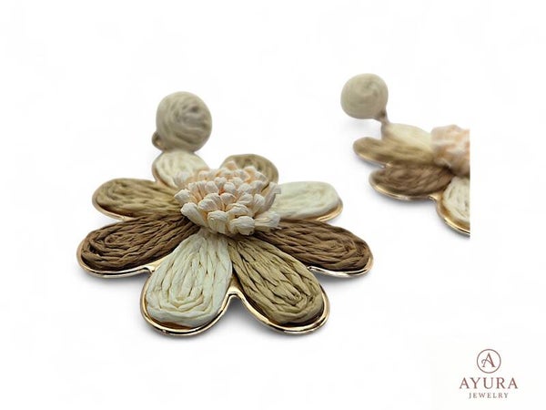 Voeg een natuurlijke en elegante touch toe aan je outfit met deze bohemian oorbellen voor dames. De oorbellen zijn koperkleurig en voorzien van 8 bladeren, elk ingelegd met crepe in zachte aardse tinten, waardoor ze een warme, organische uitstraling hebben.