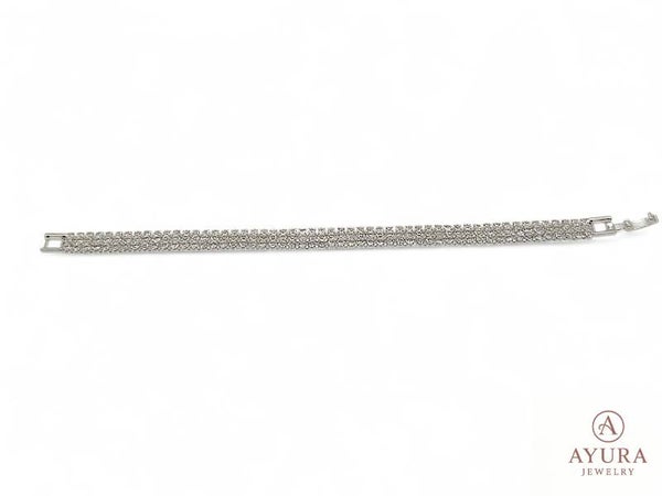 Deze prachtige dames armband van roestvrijstaal is een absolute blikvanger. Ook wel bekend als een tennisarmband, bestaat dit sieraad uit drie rijen fonkelende zirkonia die bij elke beweging schitteren. De combinatie van duurzaam roestvrijstaal en sprankelende stenen geeft deze armband een tijdloze en luxe uitstraling.