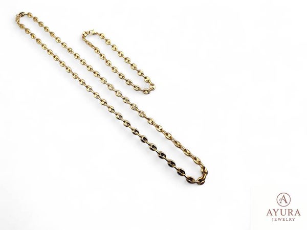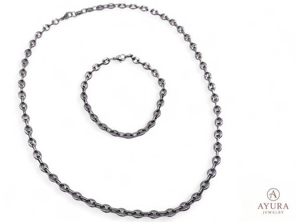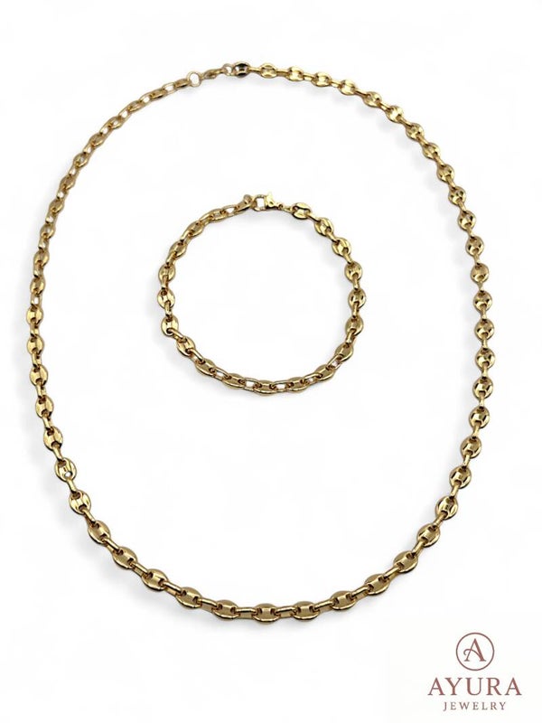 Geef je sieradencollectie een stijlvolle upgrade met deze elegante dames set bestaande uit een halsketting en armband in klassieke koffieboon schakel. De set is gemaakt van hoogwaardig roestvrijstaal en is verkrijgbaar in zowel zilverkleurig als goudkleurig, waardoor je hem moeiteloos kunt combineren met iedere outfit.