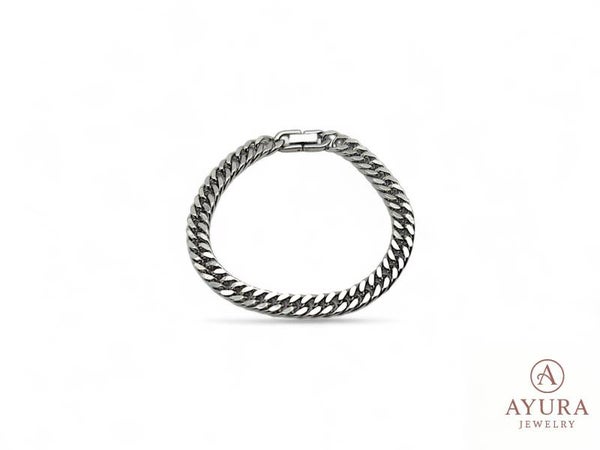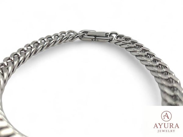 De armband is verkrijgbaar in 21 cm en 23 cm, heeft een breedte van 7 mm en een gewicht van 25 gram, waardoor hij comfortabel draagt en tegelijkertijd een krachtig statement maakt. Het duurzame roestvrijstaal behoudt zijn glans en stevigheid, geschikt voor dagelijks gebruik of speciale gelegenheden.
