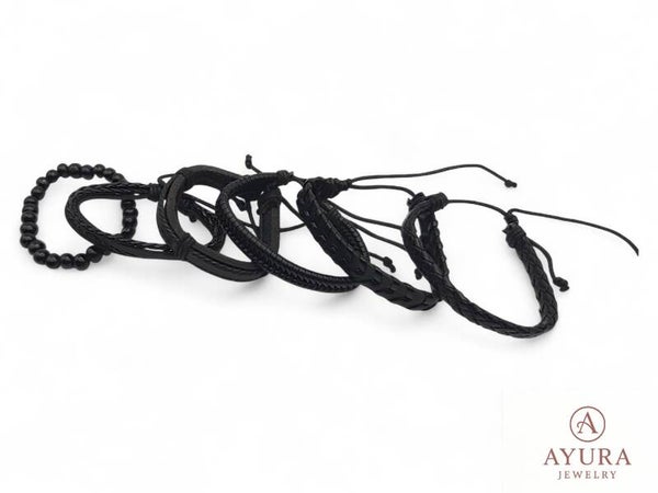 Set van 6 heren armbanden – leer, kralen en stevig vezelkoord, verstelbaar