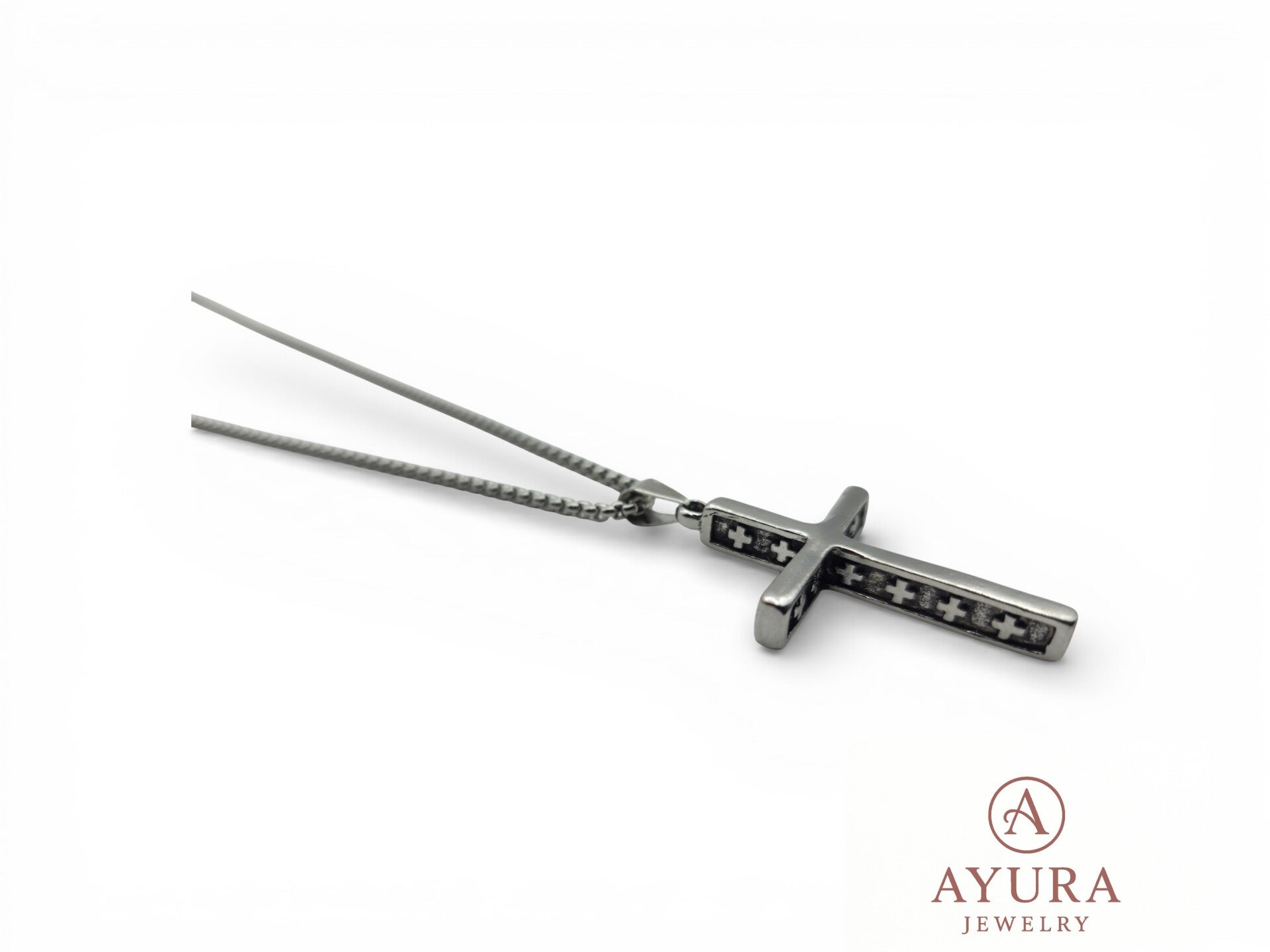 Deze zilveren RVS herenketting met kruis combineert minimalisme en karakter en is een stijlvolle toevoeging aan de collectie van Ayura Jewelry.