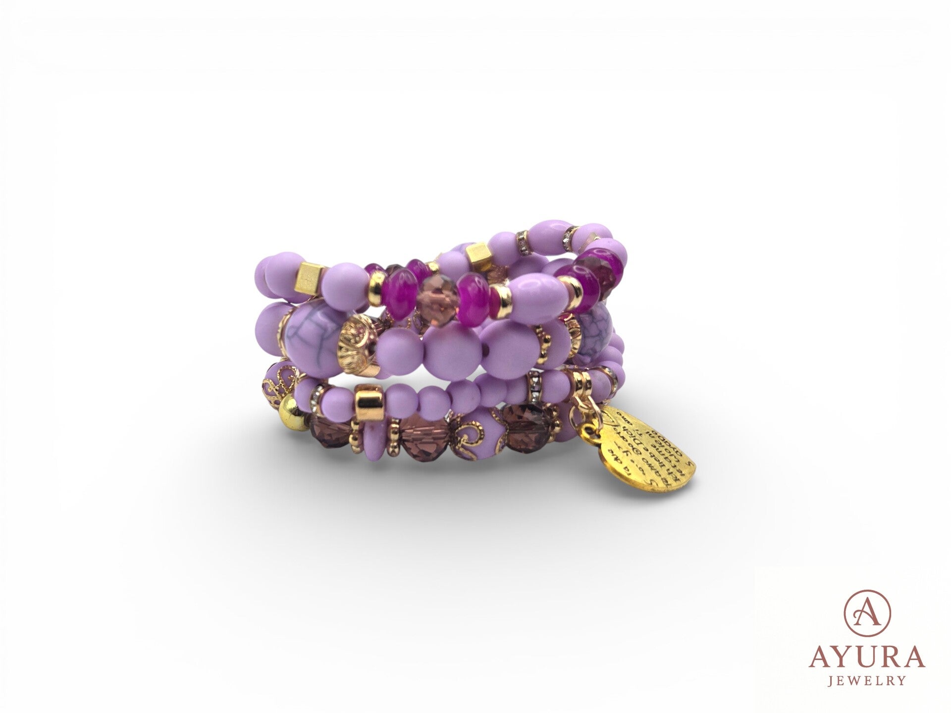 Deze paars-lila dames armbanden set combineert zachte kleurtonen met luxe gouden details en is een elegante toevoeging aan de collectie van Ayura Jewelry.
